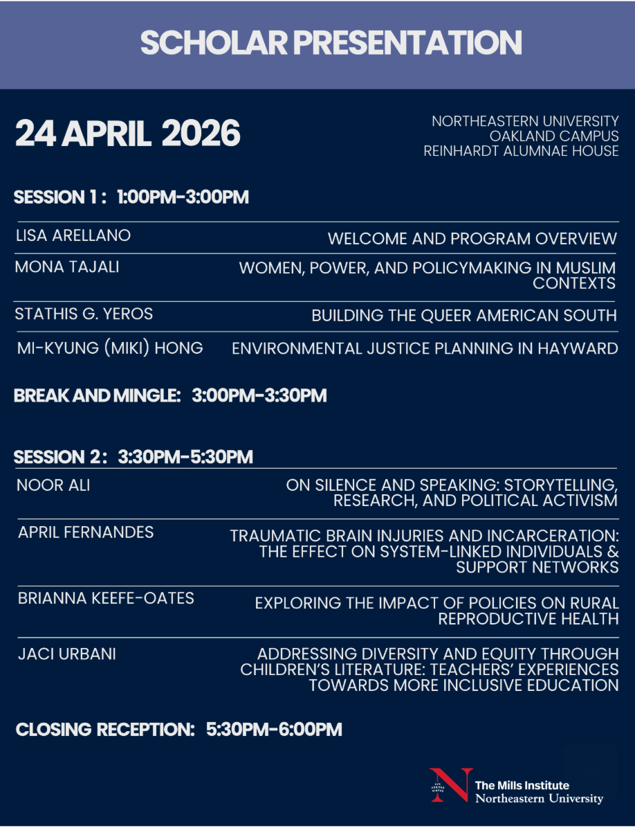 The Research Justice at the Intersections (RJI) Program at the Mills Institute at Northeastern, Oakland, fosters social justice-oriented research and groundbreaking critical analysis by creating an interdisciplinary community of scholars. RJI scholars consider new forms of knowledge production that challenge traditional research hierarchies, mobilize the leadership of those directly affected by the investigated phenomena, and acknowledge and promote subaltern ways of knowing.